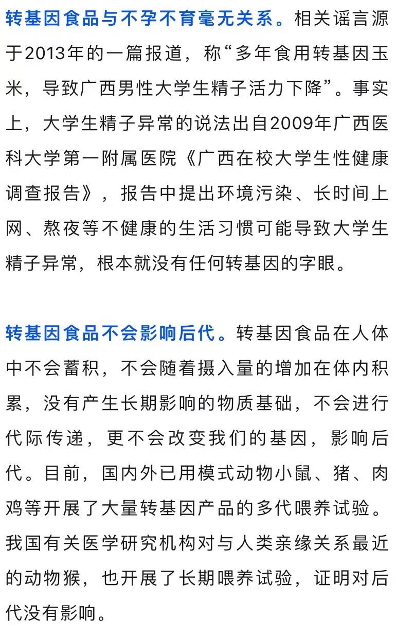 答:至于傳說中的轉基因食品會致癌、引起不孕不育、影響后代等,都是謠言。有關部門和專家用科學試驗和生產實踐的大量數據事實多次予以澄清,但在互聯網上仍然反復出現,誤導了不少人,這些謠言中,有的是道聽途說,有的則是別有用心。