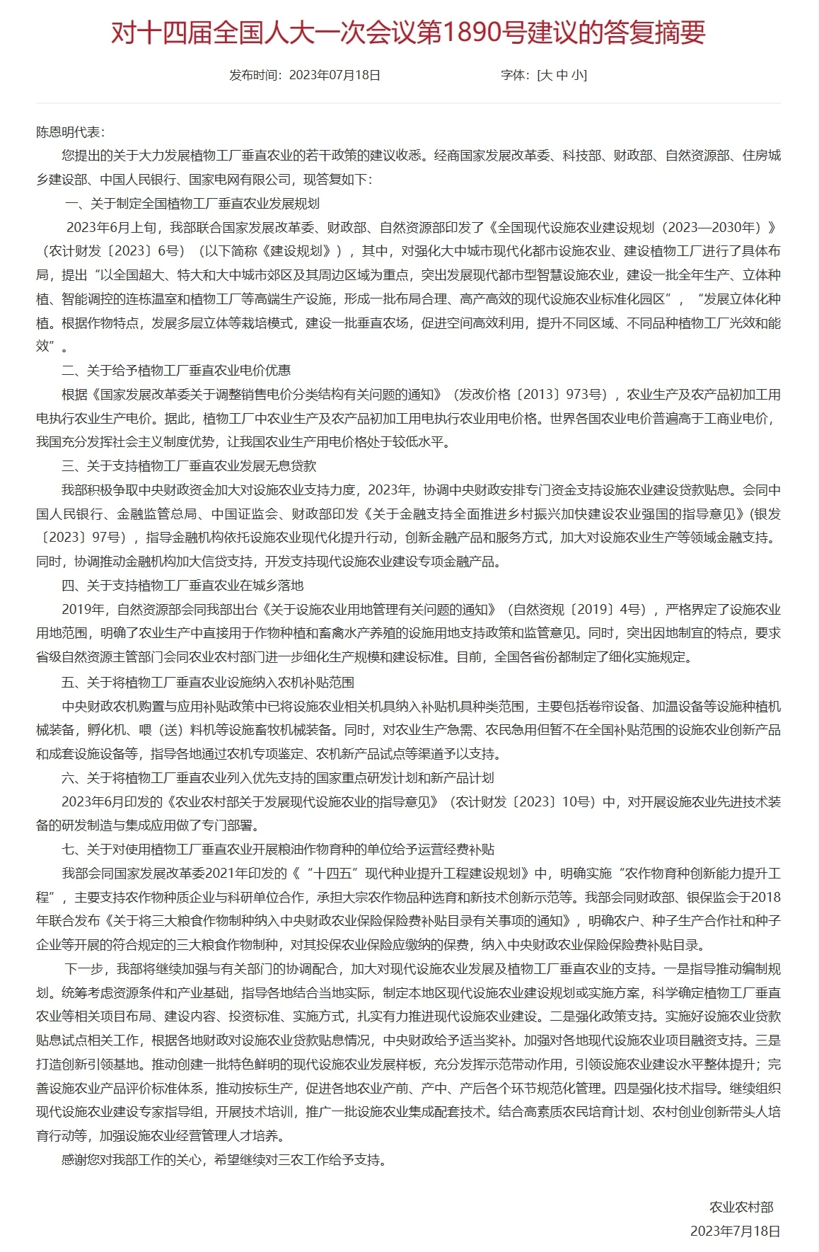 近日,中國農業農村部公布了“對十四屆全國人大一次會議第1890號建議的答復摘要”。其中提到了目前我國關于大力發展植物工廠垂直農業的若干政策,具體如下:
