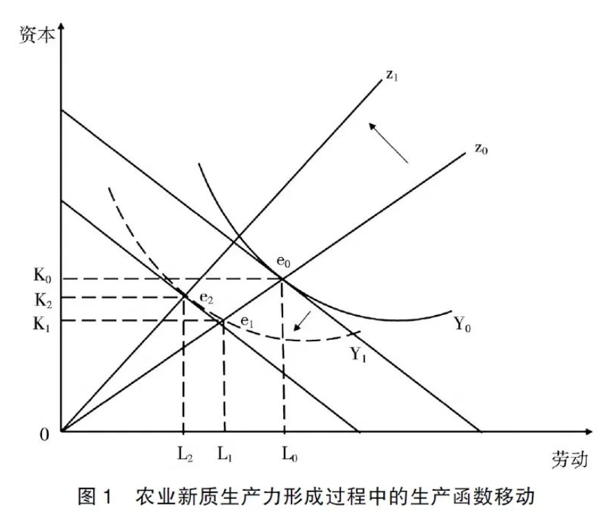 農(nóng)業(yè)技術(shù)創(chuàng)新是農(nóng)業(yè)新質(zhì)生產(chǎn)力形成的核心,表示“農(nóng)業(yè)生產(chǎn)函數(shù)的移動(dòng)”,如圖1所示,在生產(chǎn)函數(shù)由Y0移至Y1的過程中,L0L2的勞動(dòng)與K0K2的資本均得到了節(jié)約,并且最小成本的切點(diǎn)也由e0降低至e2,因而對(duì)農(nóng)業(yè)發(fā)展的作用可以達(dá)到很高的水平。黨的二十大報(bào)告提到,“必須堅(jiān)持科技是第一生產(chǎn)力、人才是第一資源、創(chuàng)新是第一動(dòng)力,深入實(shí)施科教興國(guó)戰(zhàn)略、人才強(qiáng)國(guó)戰(zhàn)略、創(chuàng)新驅(qū)動(dòng)發(fā)展戰(zhàn)略,開辟發(fā)展新領(lǐng)域新賽道,不斷塑造發(fā)展新動(dòng)能新優(yōu)勢(shì)”。研究表明,20世紀(jì)初,一些經(jīng)濟(jì)發(fā)達(dá)國(guó)家的農(nóng)業(yè)生產(chǎn)力增長(zhǎng)中只有20%是靠技術(shù)創(chuàng)新實(shí)現(xiàn)的,但是到了70年代,農(nóng)業(yè)技術(shù)創(chuàng)新對(duì)農(nóng)業(yè)生產(chǎn)力增長(zhǎng)的貢獻(xiàn)已經(jīng)達(dá)到了60%~80%??傊r(nóng)業(yè)新質(zhì)生產(chǎn)力的形成過程中,突破性創(chuàng)新是基礎(chǔ)和前提,重大新技術(shù)應(yīng)用是主要依托,現(xiàn)代先進(jìn)要素是引領(lǐng)農(nóng)業(yè)要素投入結(jié)構(gòu)改善和資源利用效率提升的主要標(biāo)志,最終推動(dòng)農(nóng)業(yè)全要素生產(chǎn)率大幅提升。農(nóng)業(yè)新質(zhì)生產(chǎn)力形成在農(nóng)業(yè)農(nóng)村發(fā)展過程中起著十分重要的催化作用,其滲透于生產(chǎn)力三要素之中,目標(biāo)是激活農(nóng)業(yè)生產(chǎn)要素創(chuàng)新性配置潛力,推動(dòng)農(nóng)業(yè)產(chǎn)業(yè)深度轉(zhuǎn)型升級(jí),實(shí)現(xiàn)農(nóng)村經(jīng)濟(jì)高質(zhì)量發(fā)展,并因此成為提高農(nóng)業(yè)生產(chǎn)效率和農(nóng)產(chǎn)品質(zhì)量、降低資源消耗的農(nóng)業(yè)經(jīng)濟(jì)內(nèi)涵式增長(zhǎng)的關(guān)鍵。