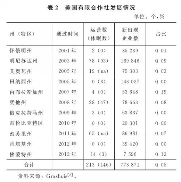 Grashuis通過商業登記資料匯總了有限合作社發展狀況,截至2017年5月,11個州(特區)的數據如表2所示③。創始的懷俄明州僅有2個有限合作社,哥倫比亞特區、肯塔基州是空白,田納西州、俄克拉荷馬州各有3個,內布拉斯加州有4個。相對來講,密蘇里州、猶他州、明尼蘇達州應用較多,分別有65個、75個、171個。以明尼蘇達州為例,從2003—2015年共成立了近17萬個新的企業組織,其中有限合作社僅占0.09%。在11個州中,從2003—2015年共成立了773871個新的企業組織,其中有限合作社僅占0.05%。在為數不多的有限合作社中,還有很多處于休眠狀態,能夠運行的有限合作社為213個,休眠合作社為146個。