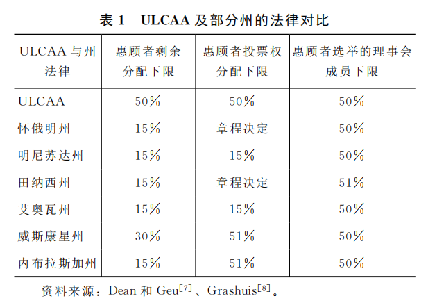 有限合作社制度設計的基本思路是引入外部出資者成為正式成員,一方面賦予外部出資者權利,加大其出資的積極性,解決合作社的資本問題;另一方面保持惠顧成員在合作社中的主體地位,在惠顧成員內部保持合作社原則。在剩余分配上,要求惠顧成員的盈余分配占一定比例?;蓊櫝蓡T內部按惠顧量分配,出資成員內部按出資量分配。在投票權分配上,要求惠顧成員的投票權占一定比例。有限合作社在投票方式上是二次計票,不同類型成員首先內部投票,超過半數通過就視為獲得全體同類成員的票數,然后不同類型成員票數加總。比如如果惠顧成員有2/3的投票權,惠顧成員多數同意一項決議,就意味著這項決議獲得了2/3的票數。在理事會成員選舉上,惠顧成員單獨選舉出部分理事會成員,這些理事會成員占有一定比例的理事會投票權。ULCAA及部分州在上述事項上的設計見表1。