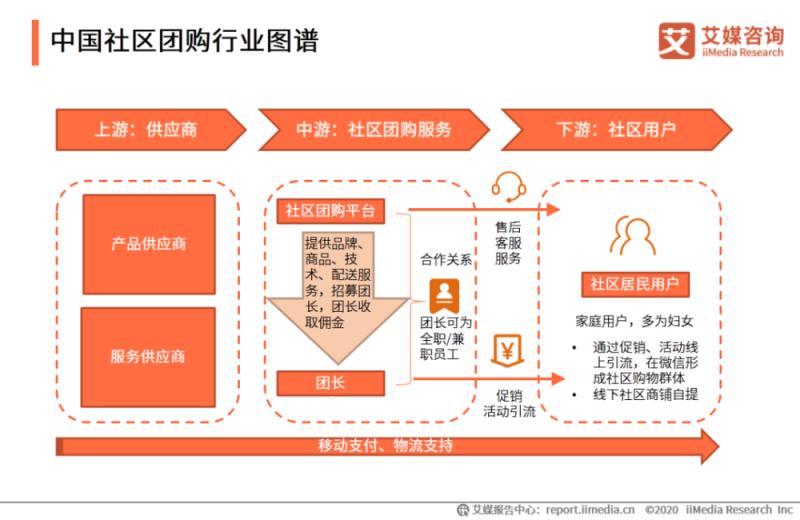 從產業鏈上看,各大電商平臺為內容提供者,提供的內容為產品與服務,產品類似于生鮮、果蔬、日用品等社區生活中常用到的需求量比較大的產品。