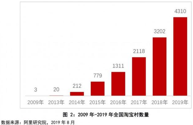 同一天發布的《中國淘寶村十年報告》顯示,從 2009 年到 2019 年,中國淘寶村已正式進入了爆發期。目前全國有超過 4000 個淘寶村,有超過 800 萬名淘寶村民,創造近 700 萬個就業崗位,阿里巴巴平臺上有四分之一的網點來自淘寶村。過去一年,400 多個淘寶村將產品銷售全世界,銷售額超過 1 億元?!吨袊詫毚迨陥蟾妗奉A計,下一個十年,全國淘寶村將超過 2 萬個,帶動超過 2000 萬的就業機會。