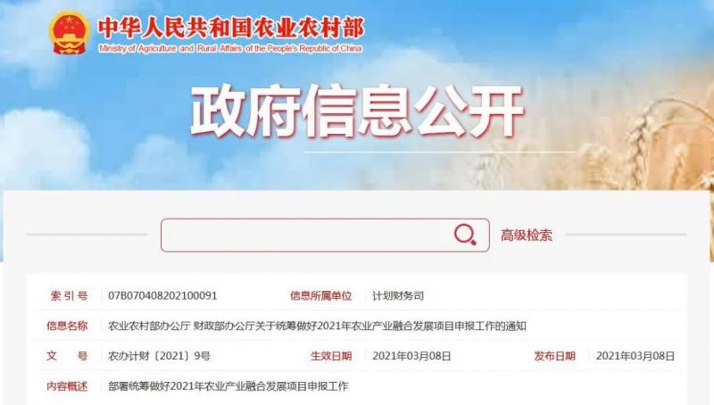 近日,農業農村部辦公廳、財政部辦公廳印發2021年農業產業融合發展項目相關文件,明確2021年中央財政支持新創建50個國家現代農業產業園。