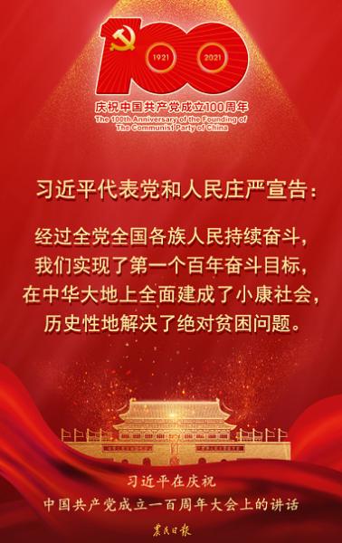 習近平代表黨和人民莊嚴宣告,經過全黨全國各族人民持續奮斗,我們實現了第一個百年奮斗目標,在中華大地上全面建成了小康社會,歷史性地解決了絕對貧困問題,正在意氣風發向著全面建成社會主義現代化強國的第二個百年奮斗目標邁進。這是中華民族的偉大光榮!這是中國人民的偉大光榮!這是中國共產黨的偉大光榮!
