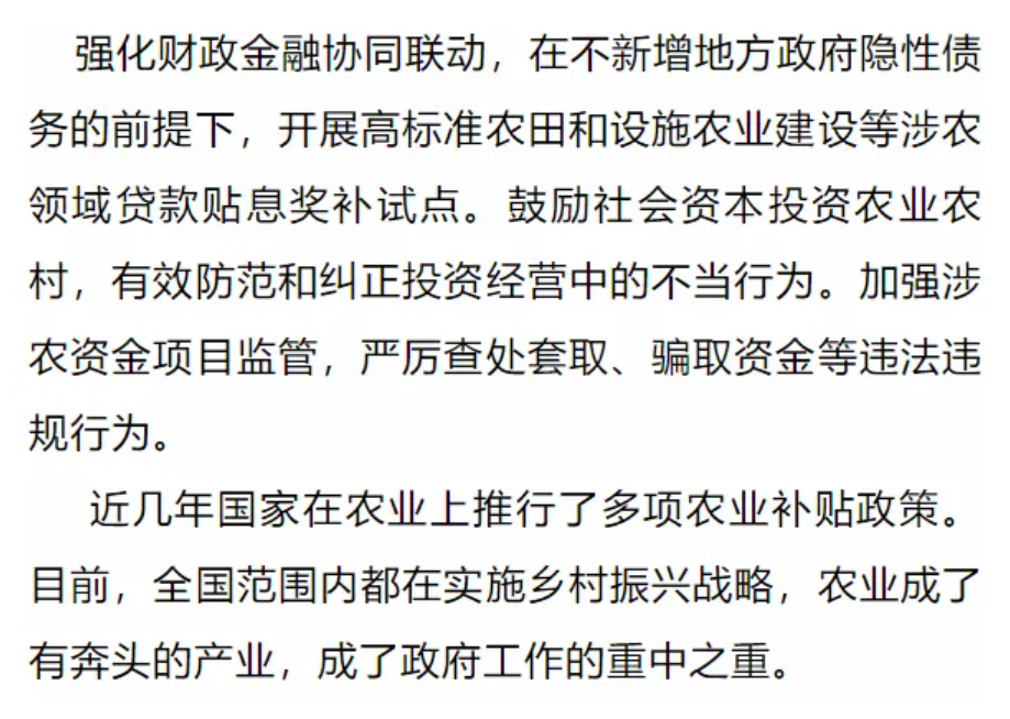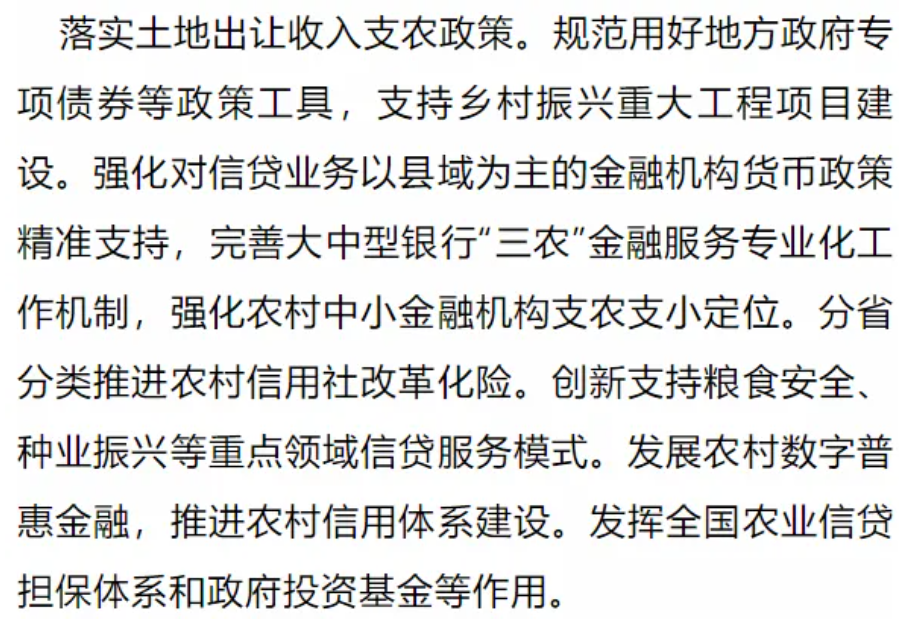 2024年中央一號文件指出:完善鄉村振興多元化投入機制。堅持將農業農村作為一般公共預算優先保障領域,創新鄉村振興投融資機制,確保投入與鄉村振興目標任務相適應。