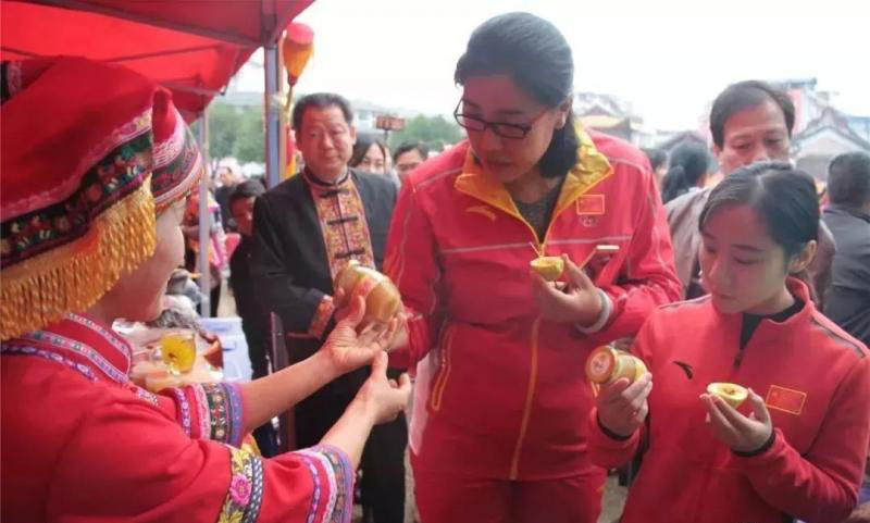 活動開幕式后,奧運冠軍奚愛華和鄧琳琳走到現場特產展區,與當地群眾共同品鑒恭城縣特色美食和特色農產品,向來自四面八方的游客介紹、推廣當地的油茶和月柿等特產。