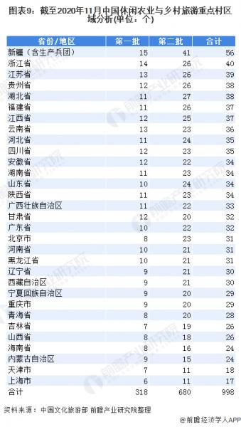 2019年7月30日,中國文化旅游部開始公示全國第一批鄉村旅游重點村名單,2020年8月26日,文化和旅游部、國家發展改革委決定將北京市門頭溝區齋堂鎮爨底下村等680個鄉村列入全國第二批鄉村旅游重點村名錄。截至2020年11月,我國共有鄉村旅游重點村共998家,其中新疆地區共有重點村56個,排名第一。