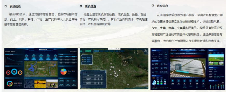 以5G信息傳輸技術為通訊手段,采用農場智慧生產需求的農田多源信息立體化快速感知技術,快速獲取氣象、 作物、土壤、病害、蟲害等多源信息,構建具有較高的預測精度和廣適性的農情立體化感知系統,通過多源信息有效融合,為作物生產管理無人作業提供數據和技術支撐。