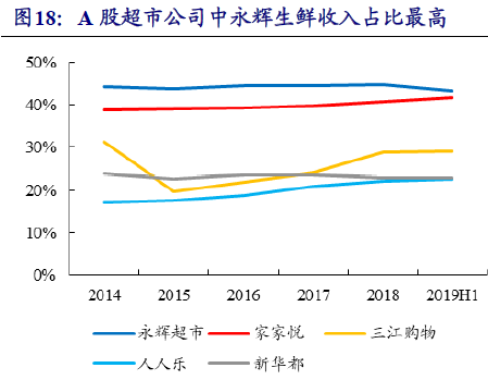 相較于其他線下商超及生鮮電商,永輝超市在生鮮品類經營上經驗更豐富。永輝超市2001年成立于福建,是由農貿市場轉型而來的。自上市以來,生鮮品類在公司營收中的占比均超過40%,是A股商超中生鮮收入占比最高的企業。因此從其傳統上來說,永輝一直比較注重對生鮮業務的投入與建設。