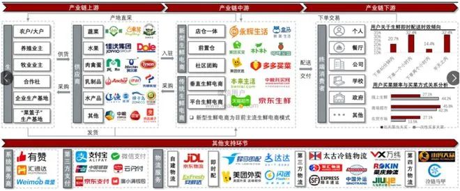 中游:通過生鮮電商搭橋,依靠物流、支付平臺等相關服務將商品配送給下游消費者