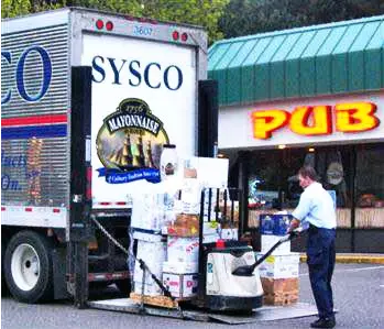 后來我們?cè)诮稚祥e逛,終于在一個(gè)PUB前面看到了Sysco送貨員的作業(yè)場(chǎng)景。這么大一輛車,竟然只配備了一名司機(jī),沒有幫忙搬貨的。美帝的人力成本是相當(dāng)昂貴的,可能考慮人力成本吧。不過人家有很好的裝備,全過程基本上不用怎么過度搬運(yùn)。其實(shí)每個(gè)客戶的訂單在倉(cāng)庫(kù)分揀好之后會(huì)被統(tǒng)一放在托盤上,上車的時(shí)候是把整個(gè)托盤一起上車的。司機(jī)卸貨的時(shí)候只需要用地牛(人家地牛還是電動(dòng)助力的!)將托盤插出來,在卡車后面有一個(gè)升降機(jī),可以直接將地牛連帶貨物下到地面。這樣的效率,比國(guó)內(nèi)乾坤大挪移(手工搬運(yùn))真是快了好多,還省力。