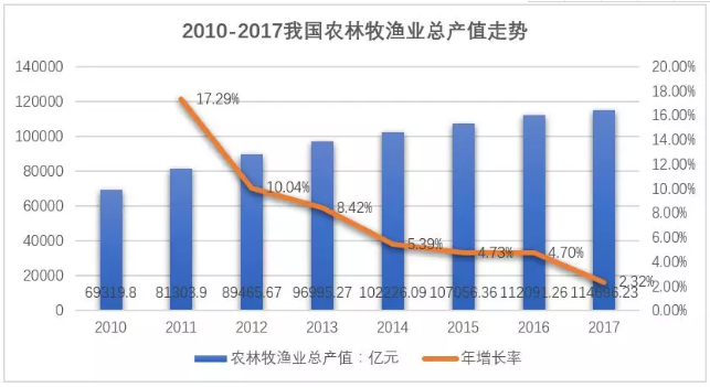 中國是農業生產大國,每年農產品生產量居世界第一。根據國家統計局數據:2010年至2017年,隨著中國加入世界經貿組織、國內社會經濟結構變革、農林牧漁產業現代化發展,農林牧漁業總產值每年都在持續增長。
