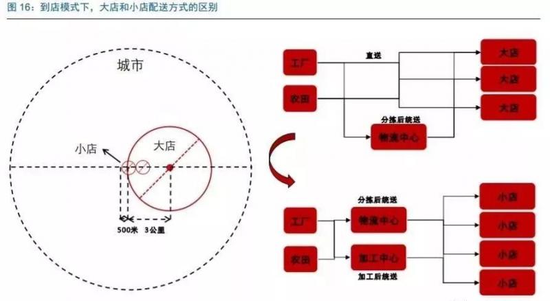 到店模式下,統一配送比例更高、需要搭建小批量多頻次的類便利店配送體系、也要求物流配送環節擁有更高的冷鏈和生鮮預加工能力。