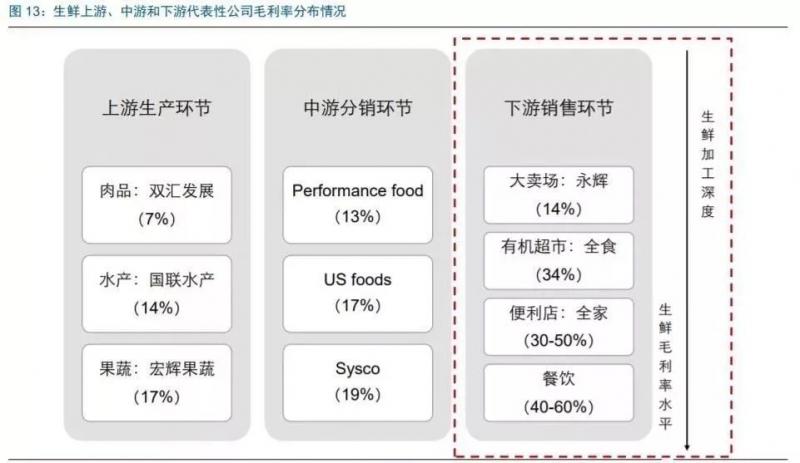 依循這一規律,我們可從生鮮下游銷售環節得到更清晰的認知:按對生鮮產品加工的深度,我們將生鮮終端流通環節分為:大賣場、有機食品超市、便利店和餐飲,其中大賣場售賣的生鮮產品大多只經過粗加工處理,而有機生鮮超市生鮮商品則經過了嚴格的精選過程,便利店相對更深一層。
