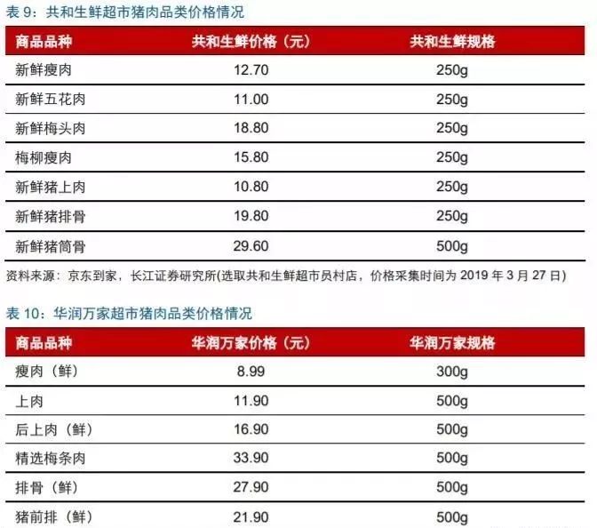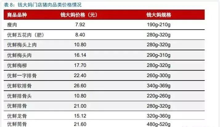以錢大媽為例,錢大媽便是通過對肉品進行更加精細化的切割和分類,從而獲得一定溢價空間?!安毁u隔夜肉”的口號充分展現出肉品是錢大媽的拳頭品種,為此我們深入研究錢大媽的肉類商品,選取豬肉肉品中較為常見的瘦肉、五花肉、梅頭肉、排骨、龍骨和筒骨等部位,對比定位較為類似的錢大媽和共和生鮮超市,并將二者與華潤萬家超市進行對比。