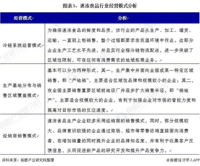 速凍食品行業(yè)經營主要有冷鏈系統(tǒng)經營、生產基地分布與銷售區(qū)域覆蓋、經銷商銷售等模式。其中,冷鏈系統(tǒng)經營模式對運輸成本及過程損耗要求較高,企業(yè)需具備包含速凍食品生產、貯藏、運輸、銷售和消費環(huán)節(jié)的完整冷鏈。