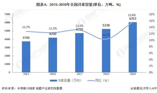 在冷庫總量方面,我國冷庫市場發(fā)展態(tài)勢明顯。據中物聯冷鏈委不完全統(tǒng)計,2019年全國冷庫總量達到約6053萬噸(折合約1.51億立方米),新增庫容815萬噸,同比增長15.56%。