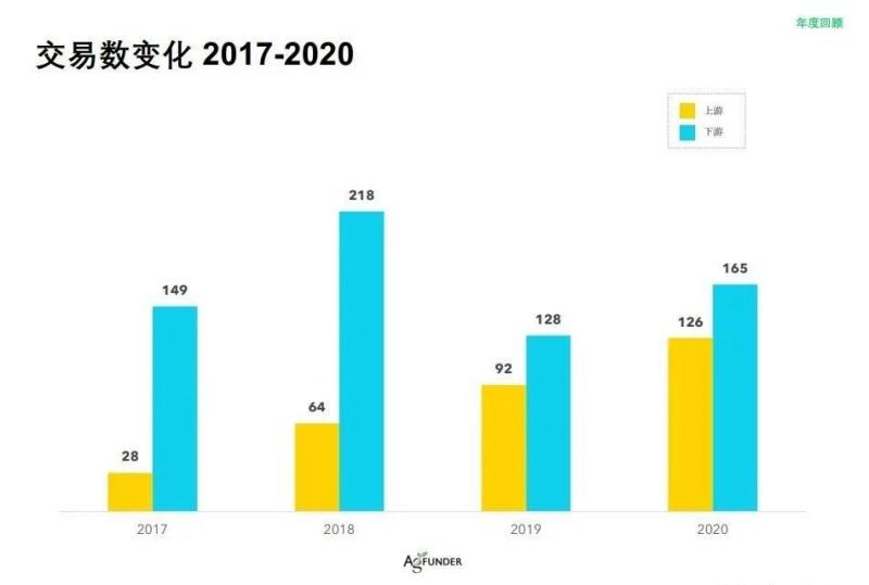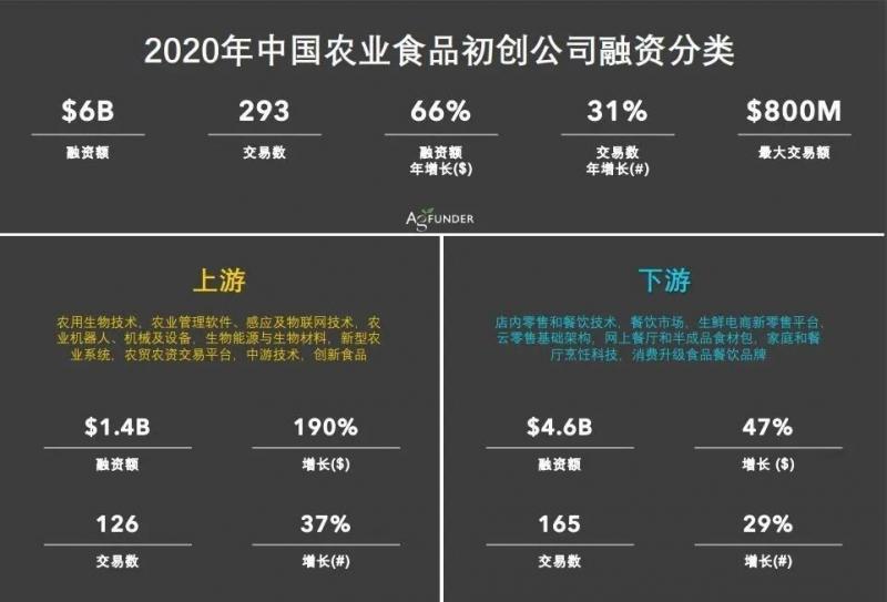 參照全球的創投市場,Ginkgo Bioworks、Benson Hill等農業食品科技公司在2021年收獲了多個IPO碩果,其中作物基因設計公司Benson Hill,2020年獲得了谷歌風投的持續加注獲得1.6億美元D輪融資,2021年5月10日該公司將通過SPAC上市,這為中國的農業科技創投市場提供了多樣化退出的參考模板。根據AgFunder的統計,2020年全球食品農業領域的投融資金額整體增長34.5%,而上游農業科技的投資金額體量自2014年至今6年來首次反超了下游,可見中國的上游科技投資潛力巨大。