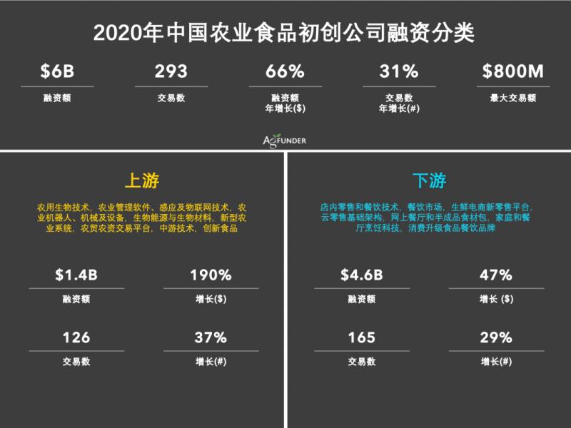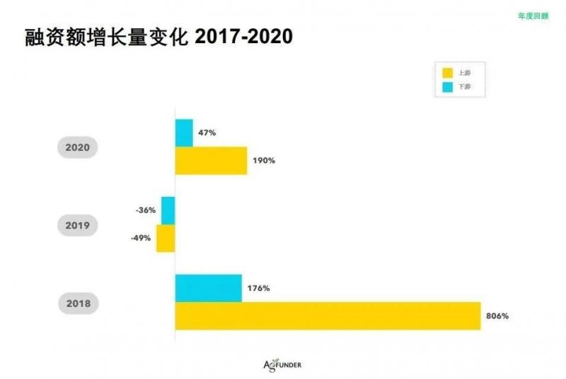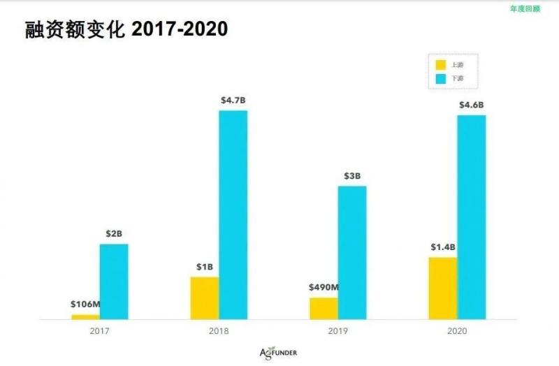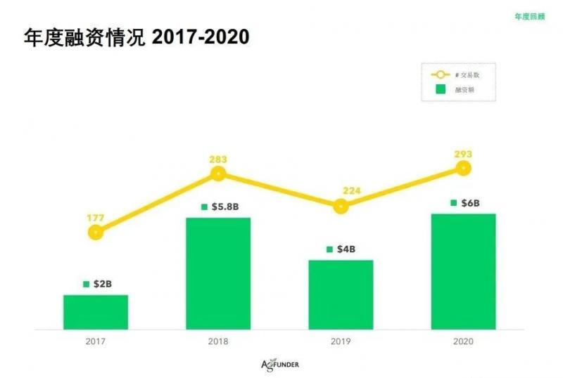 中國股權投融資市場的整體金額在2020年驟降了50%,相比之下,2020年中國的農業食品初創企業融資金額卻逆市上漲66.1%,達到了60億美元。其中上游農業科技融資金額創下了歷史增長記錄,同比增長了190%,占到整個行業總投資額的23.7%,遠高于2019年的13.6%和2017年的8%。