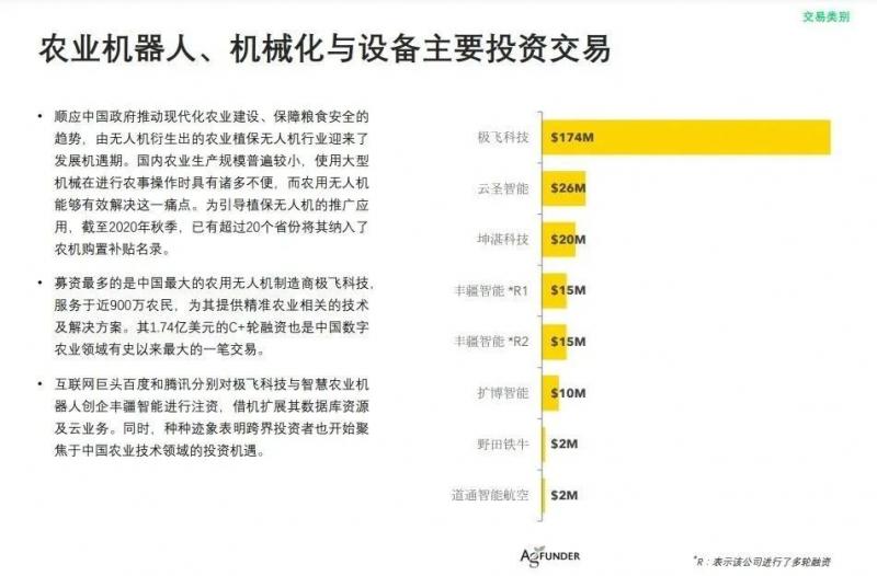 在農業機器人板塊,2020年農業無人機企業極飛科技斬獲1.74億美元C+輪融資,創下了迄今為止中國農業科技領域最大的一筆融資,其投資方包括創新工場、百度資本、軟銀愿景基金等TMT領域的跨界投資人。2021年3月,極飛更是宣布完成由高瓴追加投資超3億元人民幣的C++輪融資??萍紕撈筘S疆智能也獲得了騰訊領投的數億元人民幣A輪融資。