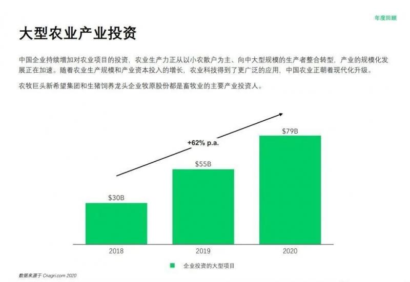 2020年,國有企業及民營企業對大型農業項目的產業投資增漲了43.6%,達到790億美元。日益擴大的農業生產規模為科技創新升級創造了高速發展的沃土,產業端的需求得到了提振與釋放。