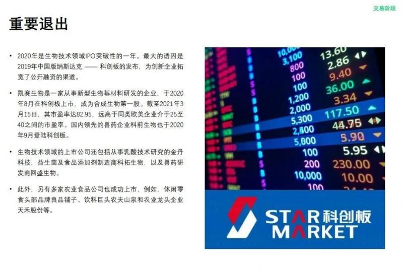 農用生物科技的初創企業投融資交易數量從2019年的3筆暴漲到了2020年的25筆,IPO企業數量也獲得了迅猛增長。新型生物基材料研發企業——凱賽生物,和獸藥研發商——科前生物先后登陸了科創板;功能性原料企業金丹科技、科拓生物等也都陸續成功上市。