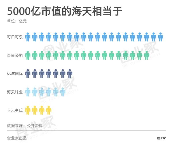 海天味業(yè)成為中國價(jià)值最高的食品企業(yè),達(dá)到5000億。就食品行業(yè)來看,海天味業(yè)的市值碾壓大部分食品公司。與國內(nèi)其他食品巨頭相比,海天味業(yè)目前5000億市值,大致為2.3個(gè)伊利(市值2158億),或者5.3個(gè)雙匯(市值940億),或者16個(gè)中炬高新(市值304億),或者13個(gè)桃李面包(市值382億)。
