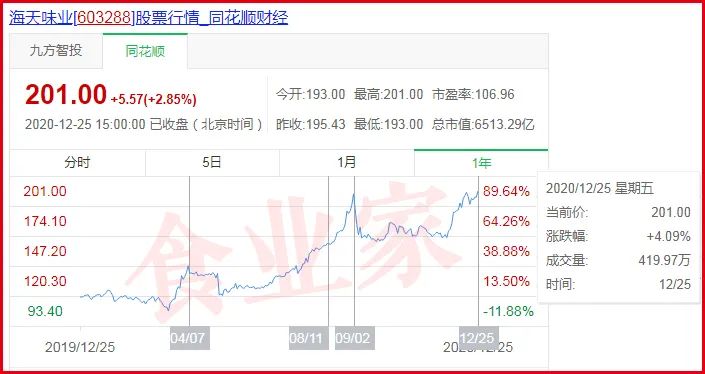 過去,提到海天味業(yè),許多人的第一印象就是醬油產(chǎn)品,2020年暴漲的股價(jià)甚至為海天味業(yè)帶來了“醬茅”的稱號(hào)。