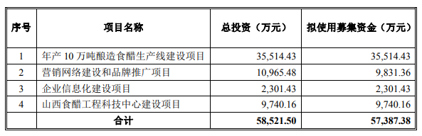 紫林醋業此次募資金額約5.74億元,在扣除發行費用后,將用于年產 10 萬噸釀造食醋生產線建設項目、營銷網絡建設和品牌推廣項目、企業信息化建設項目和山西食醋工程科技中心建設項目。