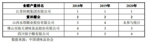 山西老陳醋是我國四大名醋之一。而從山西省內食醋生產企業的品牌影響力來看,山西省內以“紫林”“水塔”和“東湖”三大品牌為代表,具有較好的市場占有率和品牌影響力。尤其是紫林醋業,根據中國調味品協會統計,2018-2020年來紫林醋業食醋產量規模居于行業第二名,僅次于恒順醋業。