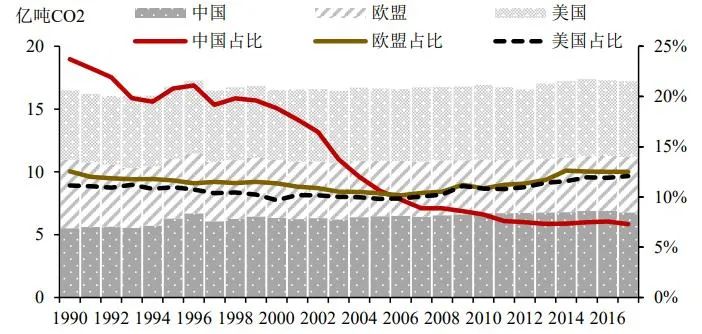 圖:中美歐農(nóng)業(yè)部門碳排放絕對值及其占本國總排放量的比重