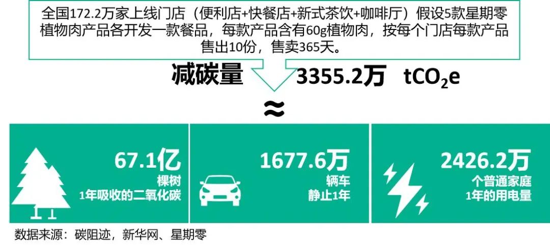 同時,按照全國便利店、新式茶飲、咖啡廳、快餐廳總數(shù)172.2萬家計算,理想情況下,按5款產(chǎn)品計算,每個門店每款產(chǎn)品每天售出10份,假設(shè)每款產(chǎn)品含有60g植物肉,售賣365天,一年合計減碳量將達(dá)到3355.2萬噸。