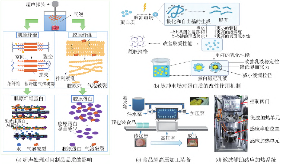 這些研究均表明: 多元物理場輔助熱加工是可用于烹飪熟化的新型加工技術,其還可以與預處理技術聯用達到更好的效果。相關新型加工技術及其裝備示意見圖1。