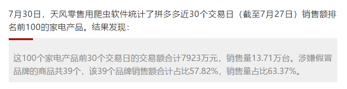 即使不看具體,看整體也非??鋸垼?018年,天風(fēng)證券用爬蟲軟件統(tǒng)計(jì)了拼多多的商品數(shù)據(jù),可以說當(dāng)時的山寨(涉嫌假冒)占比非常非常高了。
