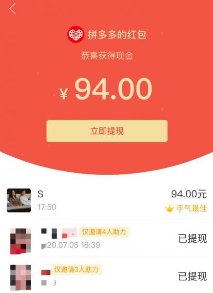 提示你直接可領(lǐng)來自拼多多的紅包,94元現(xiàn)金,并且提示你可以立即提現(xiàn),如果這時候你不相信這個紅包的真實(shí)性,拼多多拉取了你的通訊錄關(guān)系鏈,在紅包下半部分請出了你的微信好友們,并提示你,他們都已經(jīng)提現(xiàn)成功了。