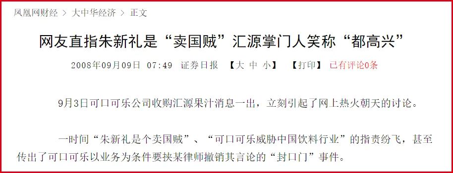 朱新禮也在接受采訪時表示,“如果2008年交易成功,我們已是千億級公司了。”但這終究沒有成為現(xiàn)實,事實上,近十年來這個“果汁大王”一路失血。以至于后來有網(wǎng)友評論:“當(dāng)年反對可口可樂收購匯源果汁的大眾,也沒有用實際行動來支持它。”