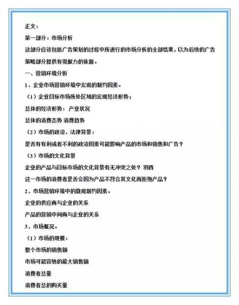 市場分析:這部分應(yīng)該包括廣告策劃的過程中所進(jìn)行的市場分析的全部結(jié)果,以為后續(xù)的廣告策略部分提供有說服力的依據(jù)。