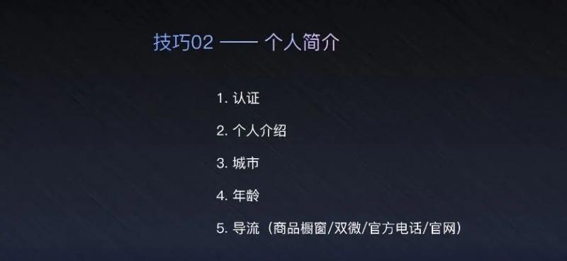 個人介紹:用一句話把自己的身份定義清楚,除可以寫出你介紹以外,其實還可以寫出你所要做的事情,什么時間段干什么。比如寫出你什么時候直播,這樣就會吸引大家在固定的時間段來平臺關注你,從而得到一些初始的流量來引流,如果你的內容是觀眾感興趣的,那么你就可以吸引到粉絲,從而進行轉化變現。也可以掛出自己的微信或微博,以及聯系方式,如果粉絲加了你的社交方式,這樣就可以轉換成你的私域流量,進行流量轉換。甚至可以寫出你對粉絲的祝福,這樣粉絲也就覺得你跟他說建立了天然聯系。個人簡介也可以寫出:TA正在關注你 這個會讓很多人誤以為他真的關注了粉絲,就會覺得博主跟粉絲有很深刻的互動。