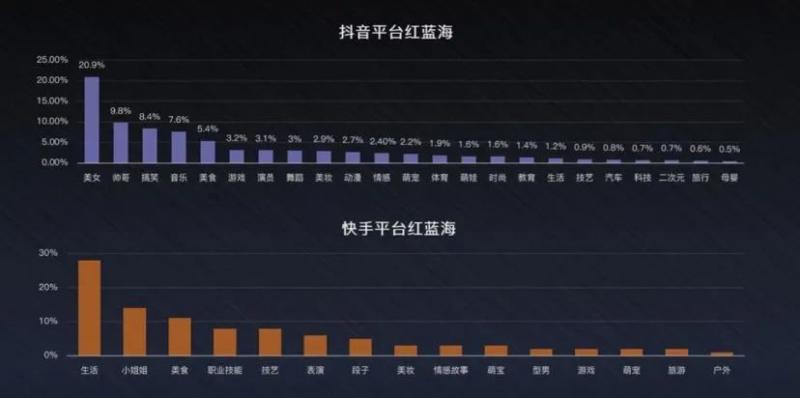 上圖是抖音和快手平臺紅藍海的數據圖,通過數據圖,你自己就會去定位這些行業,到底是紅海還是藍海,如今的網絡紅人大部分都在紅海領域,紅海領域可能流量大、吸粉快、變現快,同時也面臨創作者人群大,也就意味競爭大,在藍海領域可能沒有紅海領域那么快,需要自己沉下心來耕耘,所以我們要學會去分析,如何去找準自己想做的行業,然后在這個行業里去找我們自己能怎樣去做自己的創作。