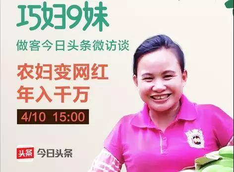 巧婦九妹,2017年5月19日開始拍攝三農(nóng)短視頻,同時在各大自媒體平臺上分享視頻。主要分享的是原生態(tài)農(nóng)村生活,趣事、美食、水果種植業(yè)......同時還利用網(wǎng)絡平臺銷售自家水果,是農(nóng)業(yè)領(lǐng)域創(chuàng)業(yè)成功的標桿。如今拍攝視頻高達700多條,全網(wǎng)粉絲高達300萬之多,總播放量超過4億之多,包含銷售農(nóng)村、自媒體廣告收入,巧婦九妹年收入可以過千萬元。