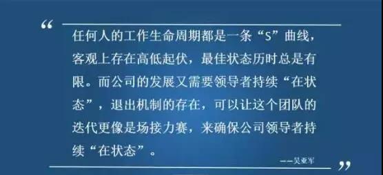第一是為了保持公司領袖持續“在狀態”。實際上,任何人的工作生命周期都是一條“S”曲線,客觀上存在高低起伏,最佳狀態歷時總是有限。而公司的發展又需要領導者持續“在狀態”,退出機制的存在,可以讓這個團隊的迭代更像是場接力賽,來確保公司領導者持續“在狀態”。