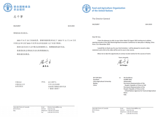 2023年9月18日,聯合國糧農組織總干事屈冬玉回信中國農業大學校長孫其信。信中表示“感謝你邀請我參加定于2023年11月2-4日在中國北京舉行的2023年世界農業科技創新大會并致開幕辭。我很樂意為本次大會開幕式錄制視頻發言,視頻鏈接將適時發送。我謹借此機會預祝此次論壇取得圓滿成功。”