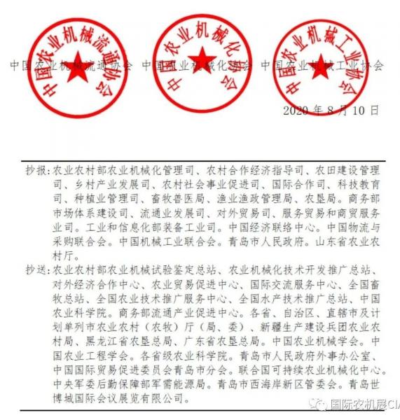 為了深入貫徹《中共中央 國務院關于抓好“三農”領域重點工作確保如期實現全面小康的意見》和《國務院關于加快推進農業機械化和農機裝備產業轉型升級的指導意見》精神,推動農機農藝融合、機械化信息化融合、農機服務模式與農業適度規模經營相適應、機械化生產與農田建設相適應,推動農機裝備產業向高質量發展轉型,推動農業機械化向全程全面高質高效升級,為實施鄉村振興戰略、實現農業農村現代化、決勝脫貧攻堅提供機械裝備支撐,2020中國國際農業機械展覽會(以下簡稱“國際農機展”)定于10月29日-31日在山東省青島市西海岸新區舉辦。