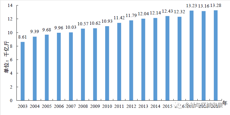 (一)為糧食安全和農產品有效供給提供強有力的物質裝備保障。在農業勞動力大量轉移的情況下,全國農作物耕種收綜合機械化率由2003年的33.5%提高到2019年的70%(見圖1),糧食年總產量由2003年的8.61千億斤提高到2019年的13.28千億斤(見圖2),我國人口從2003年的12.88億人增加到目前的14億人,如果沒有農業機械化的發展,很難養活這么多人口。畜禽養殖、水產養殖、農產品初加工、設施農業、果菜茶等各產業機械化亦快速發展。