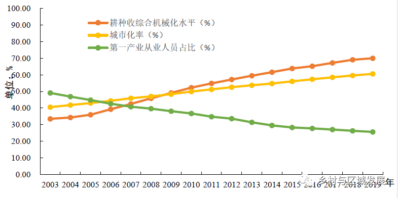 圖3  2003-2019年全國農作物耕種收綜合機械化率、城市化率、第一產業人員占全社會從業人員比重變化圖
