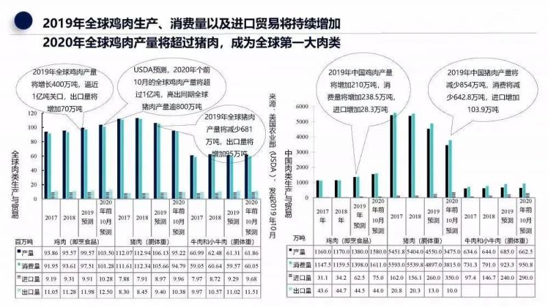 當然挑戰中往往也意味著機遇,2019年以來,非洲豬瘟疫情持續重挫豬肉生產和消費大洲的亞洲,越南和中國受到的損失尤為嚴重,這也給雞肉的帶來了巨大的機會,雞肉替代豬肉空間增大,尤其是白羽肉雞自身的優勢和當下對豬肉的替代性需求使消費市場不斷擴容,白羽肉雞企業將面臨量價齊升的歷史機遇。一方面,高蛋白、低脂肪、低膽固醇、低碳排放,資源友好的白羽雞贏得了世界的青睞,扮演著全球第一大肉類蛋白供應者的重要角色。另一方面,隨著居民健康意識的覺醒和生活節奏的加快,低脂健康且適合快餐烹飪的雞肉將會逐步取代高脂肪、高膽固醇的豬肉。