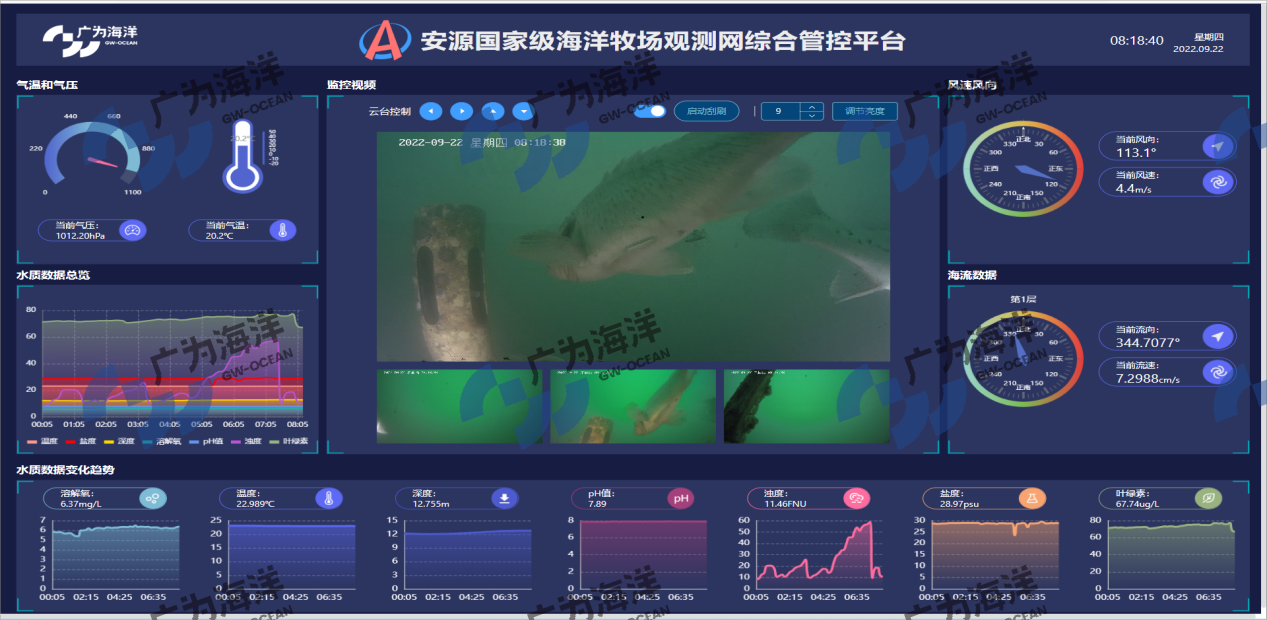 基于漁場物理場景,構建漁場的全景精細化三維模型,以漁場三維場景為交互中心,對漁場、水質(zhì)、設備等關鍵指標進行綜合監(jiān)測分析,輔助管理者全面掌控漁場運行態(tài)勢,實現(xiàn)人、車、地、事、物統(tǒng)一管理,漁場綜合運營態(tài)勢一屏掌握。