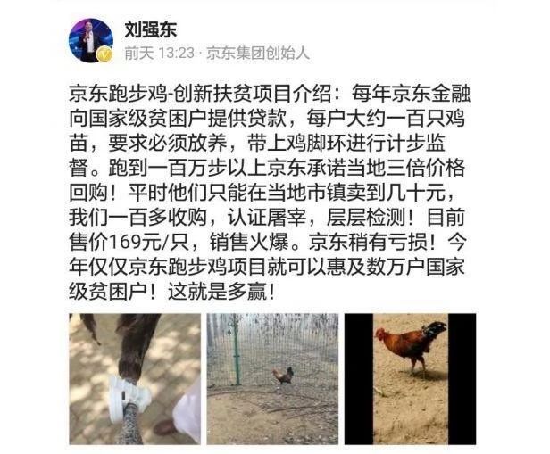 2017年5月份,京東創始人劉強東在微博上曬出京東跑步雞的扶貧項目介紹。這是京東切入養殖的第一個項目。