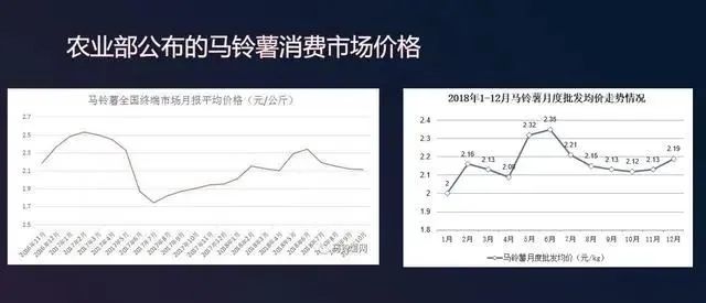 我想說(shuō)的就是這個(gè)邏輯,同等金額的貨幣,購(gòu)買(mǎi)力下降了很多。小麥的最低收購(gòu)價(jià),我們也追溯到十年前,2009年,小麥的收購(gòu)價(jià)是0.9元/斤,現(xiàn)在1.2元/斤,也是大約30%的增長(zhǎng)。玉米十年前收購(gòu)價(jià)是0.76元/斤,現(xiàn)在1元/斤。馬鈴薯從2016-2019年的數(shù)據(jù)顯示,2016年底馬鈴薯還處于高位,2017年馬鈴薯價(jià)格一直跌倒了谷底,我記得2018年2月我們的馬鈴薯大會(huì)的主題就是《活下來(lái),經(jīng)“贏”你的農(nóng)場(chǎng)》。